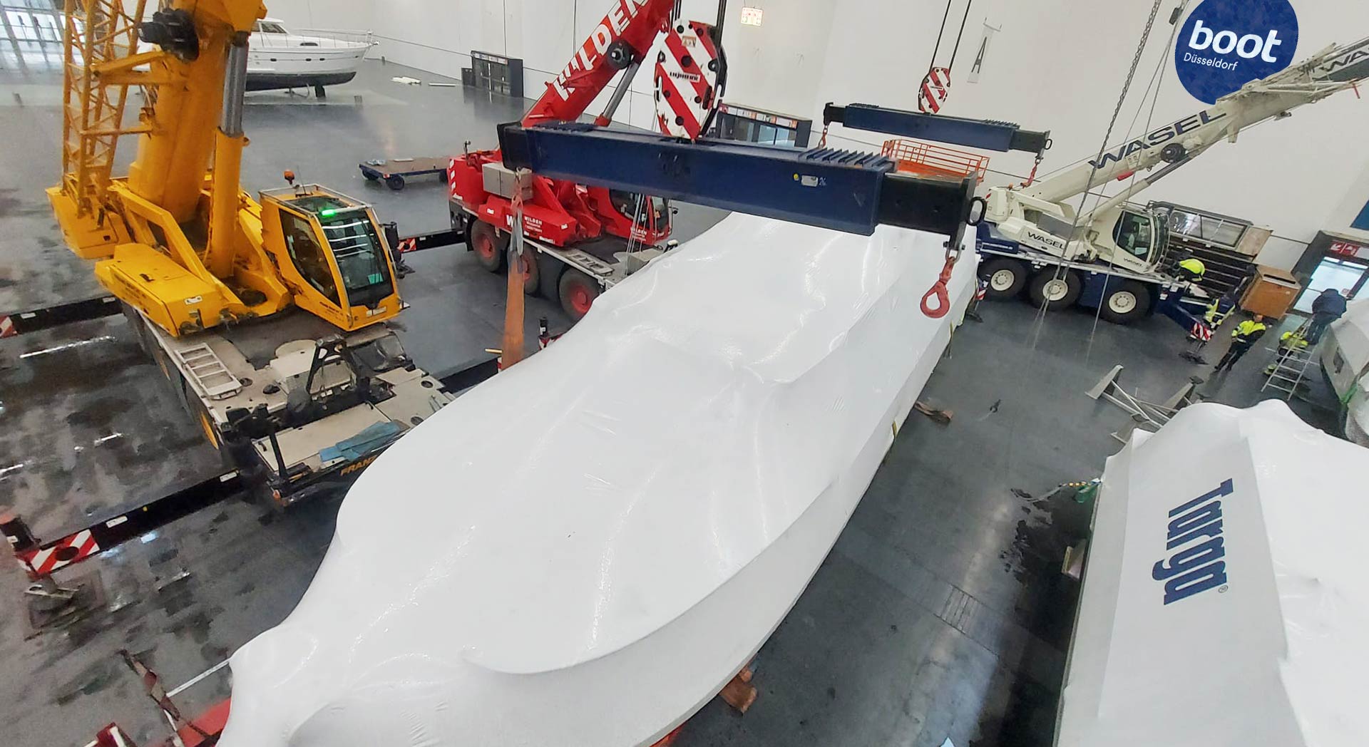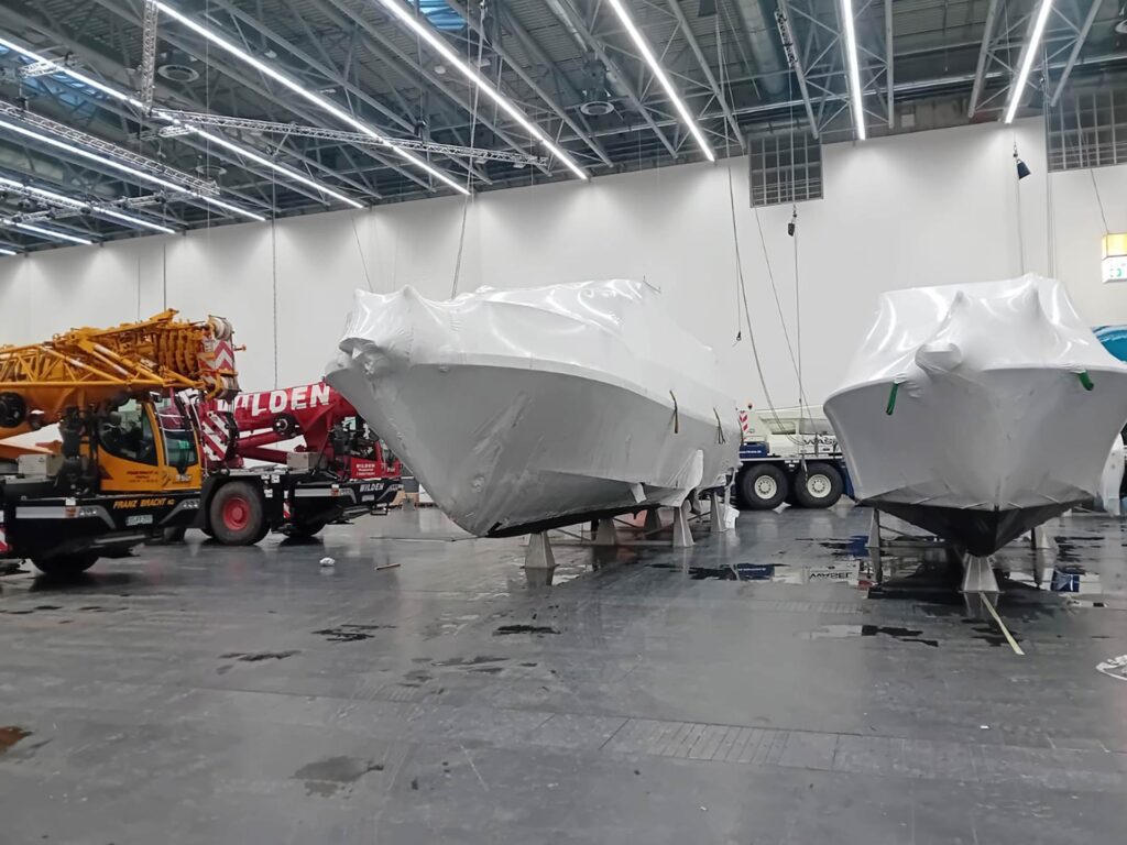 Schäden an Yachten auf einem Transport oder gar Unfälle mit Booten sind eher selten. Unsere Yachten erreichen alle pünktlich die Messe. Aber damit ist unser Job es lange noch nicht abgeschlossen. Denn anders als der DHL-Fahrer, der die neue Kommode an der Haustür abgibt und Sie diese zusammenbauen, können wir die Boote nicht einfach am Hallentor stehen lassen. Es beginnt das faszinierende Hallen-Ballett, der vielleicht aufregendste Teil der Messe-Transporte.