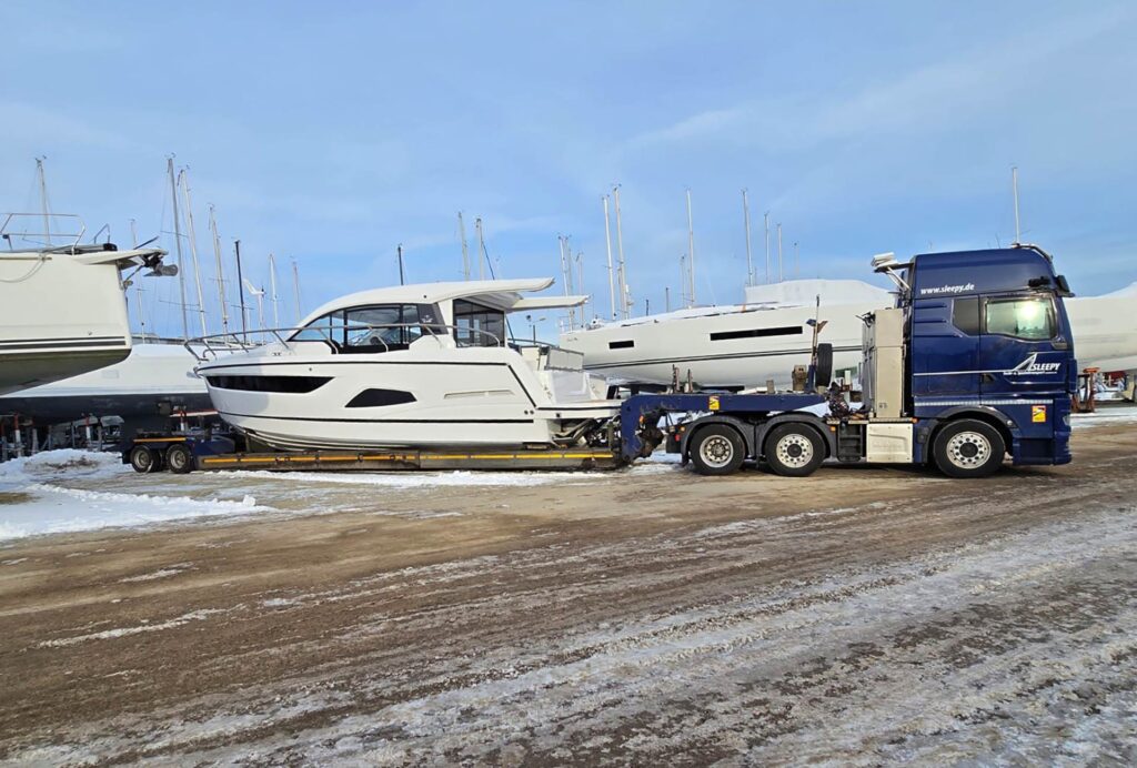 Für andere Werften fahren wir nur eine oder zwei Yachten. Neben Bavaria Yachtbau bekommt SLEEPY auch in 2026 Transportaufträge für die BOOT von verschiedenen anderen renommierten Boots-Marken und Yacht-Herstellern, wie beispielsweise Dufour, Targa, Sealine oder die Rib-Spezialisten von ZAR. In diesem Jahr ist jedoch die BOOT vor allem aus Wetter-Gründen eine Herausforderung, denn wie Sie sicher schon festgestellt haben, erleben wir einen Winter, wie wir ihn lange nicht mehr in Europa hatten …