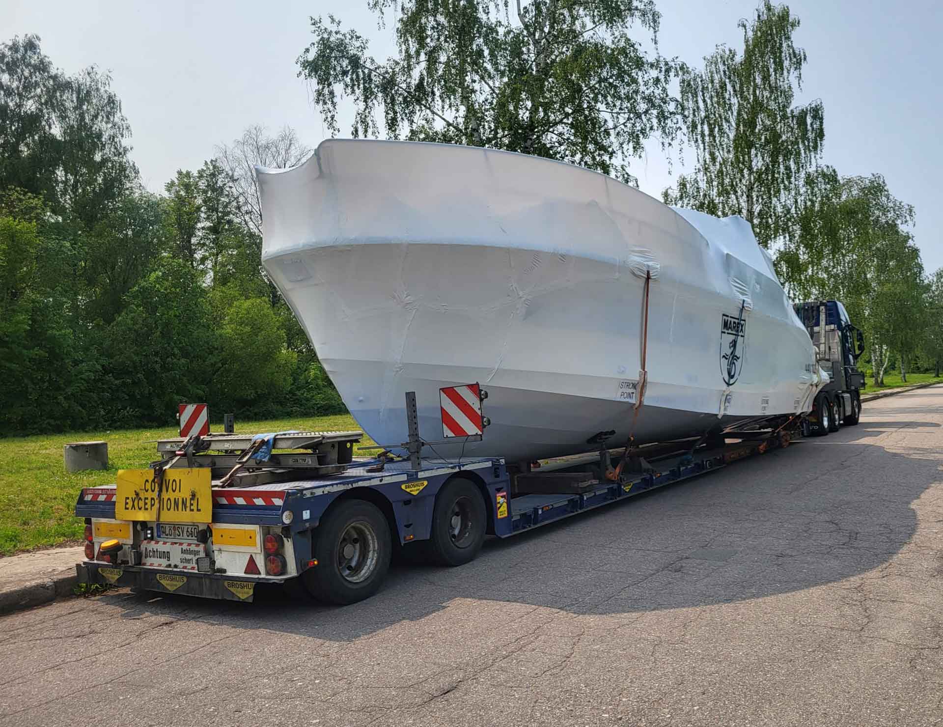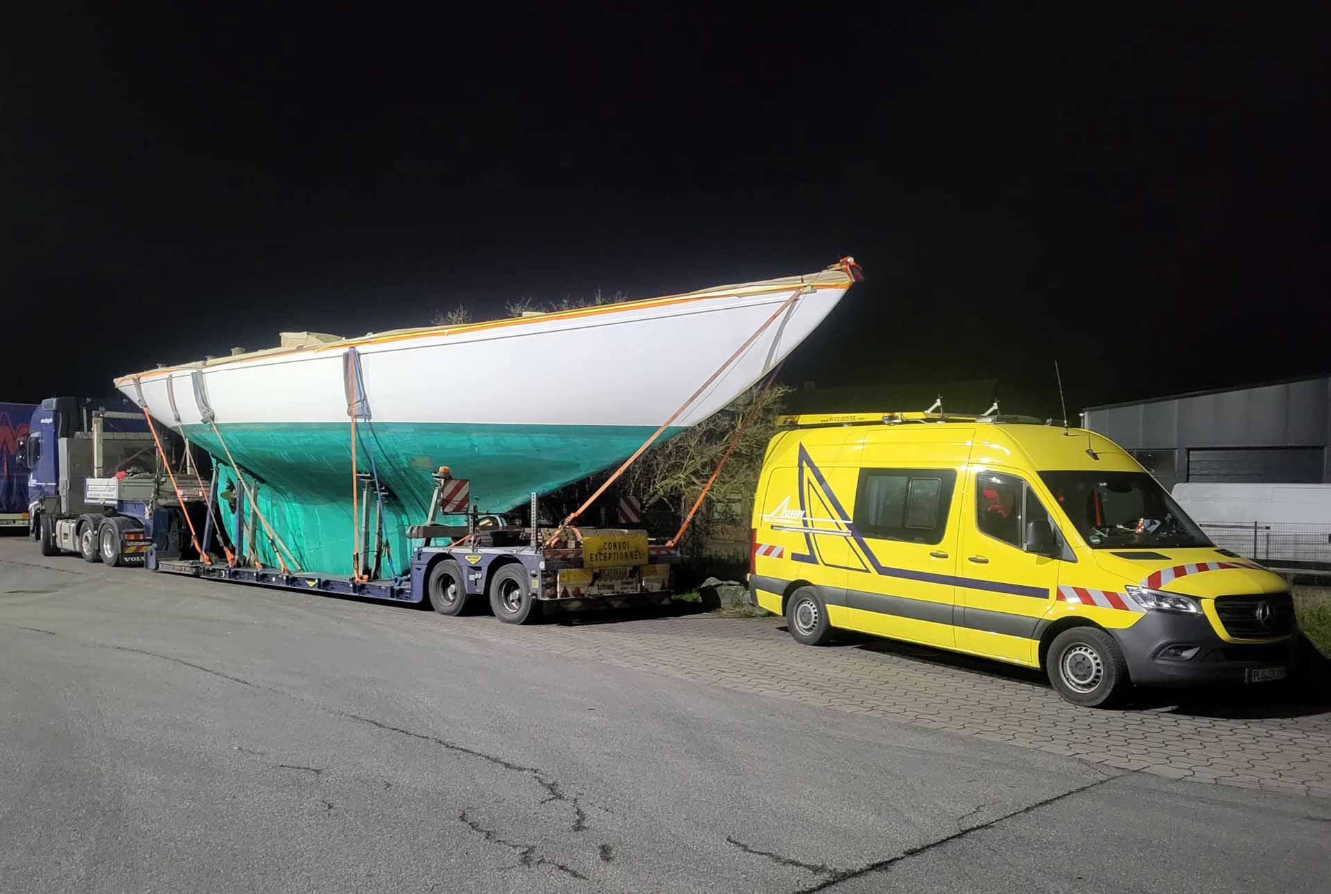 Erst kürzlich fahren wir einen Spezialmast für Hanse Yachts von Greifswald nach Frankreich zum Flaggschiff: Bei solchen Transporten stoßen auch wir mit Spezial-Racks zum Mastentransport bei maximal 30 Metern an unsere Grenzen. „Ab dann macht es mehr Sinn, das Boot vielleicht einfach selbst zu segeln.“, sagen die Fahrer und senden einen Zwinkersmiley. Allerdings sind solche Maximal-Transporte eher die Ausnahme bei uns. Das Gros der Yachten und anderen Güter, die wir bewegen, fällt weder in den maßen noch im Gewicht aus dem Rahmen. Allerdings wird es oft … speziell …