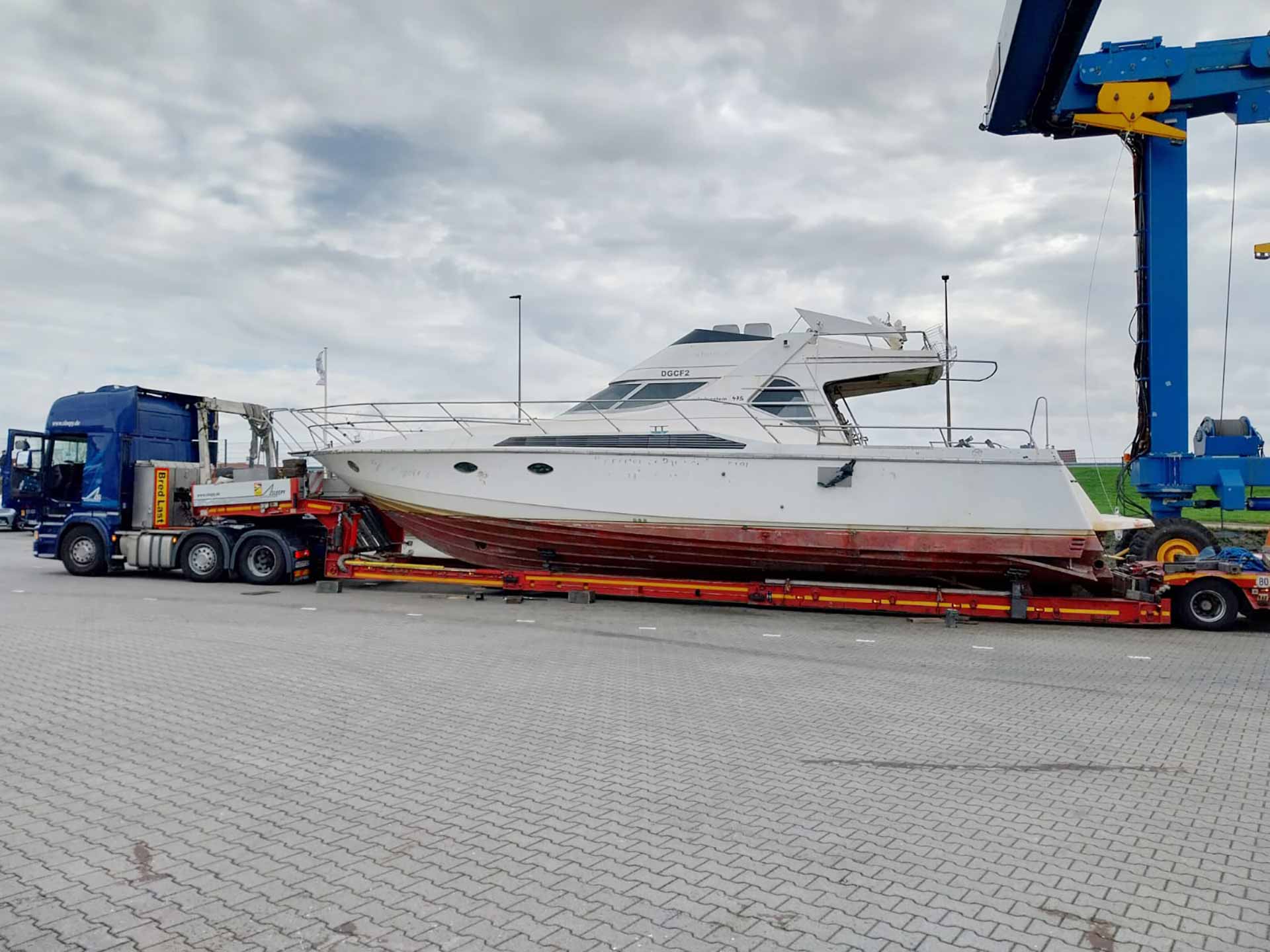 Manchmal geht das aber auch „schief“: Wie bei dem letzten Bild mit der Motoryacht. Eigentlich ein einfacher Transport, 24 km direkter Weg „um die Ecke“. Da mussten wir die Strecke zwei Nächte lang abfahren und ausmessen, bis wir einen machbaren Weg gefunden hatten. Streckenlänge nun: Über 70 Kilometer, weil eine Brücke im Weg war. Gleiches gilt natürlich für die Ladungsbreite. Yachten, aber auch Industrie-Teile oder schwere Landmaschinen fahren wir sehr häufig – und das mit bis zu 7 Metern Breite!