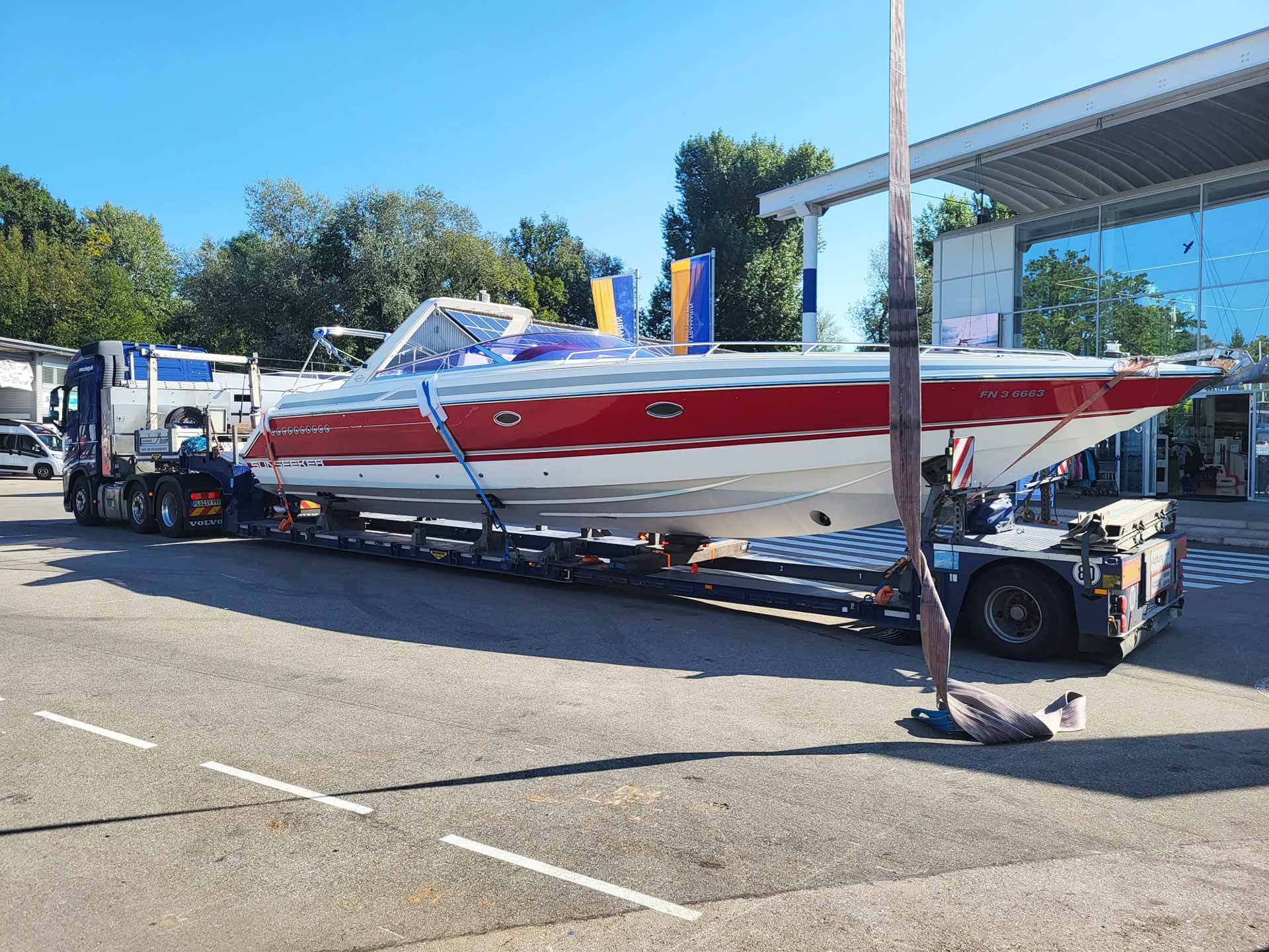 Bei der Länge gibt es weniger Probleme, wie uns die Fahrer versichern. Da müsse man nur auf die Kurvenradien achten, das man keine Häuser-Ecken oder Verkehrsinseln „mitnimmt“. Vor allem Rennyachten oder Performance-Motorboote, wie hier zu sehen eine Sunseeker, die wir vom Bodensee abgeholt haben, lassen unsere Trailer oft an ihre technischen Grenzen stoßen. SLEEPY verfügt über Aufliegersysteme, die wie ein Teleskop „ausgezogen“ werden können und sich somit der Länge des Transportgutes anpassen können. Da ist dann natürlich irgendwann Schluss: „Je nach Form des Bootes so bei knapp 25 Metern“, der Tenor der Fahrer. Denn die Yachten müssen dann ja noch gesichert werden.