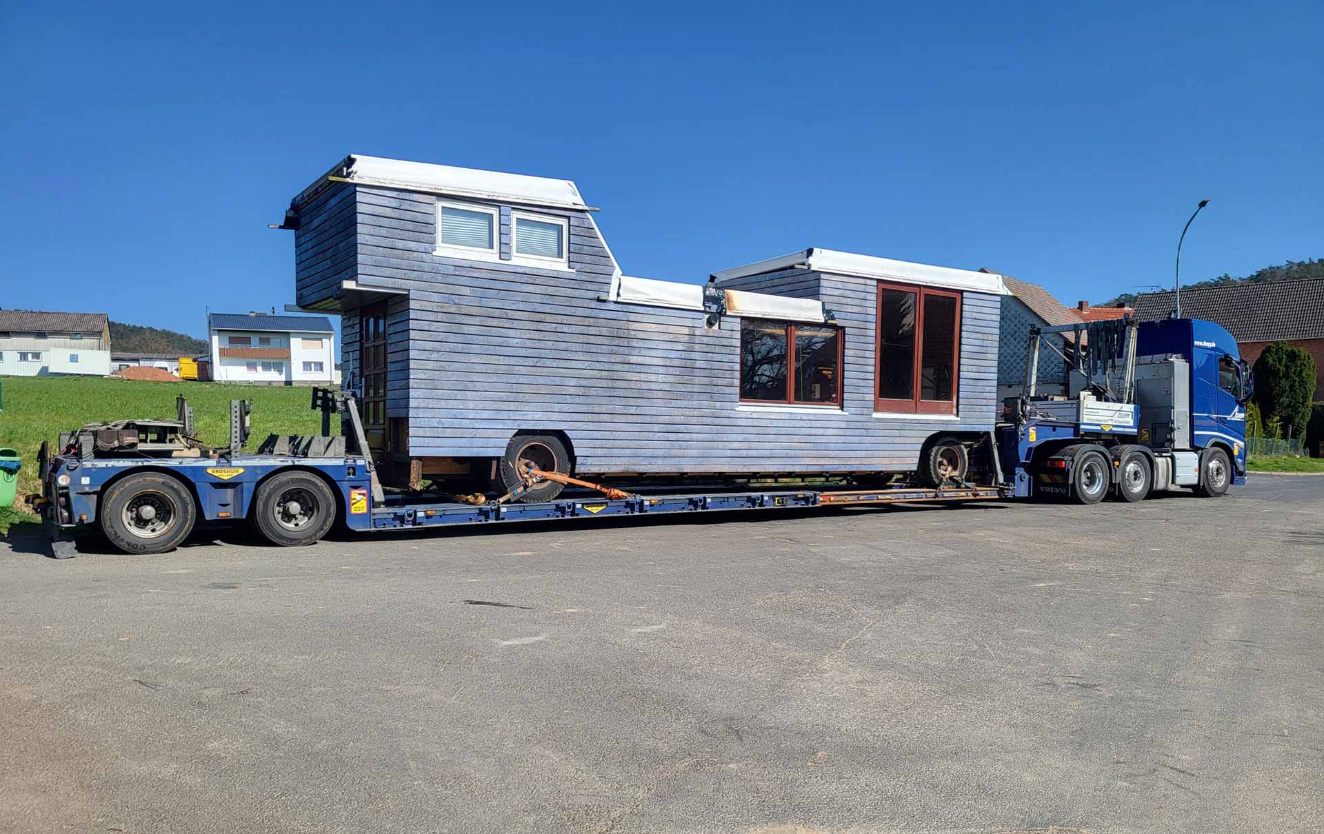Zu unseren Haustransport-Kunden zählen dabei ebenso professionelle Unternehmen und Firmen, die Serienhäuser herstellen. Ebenso wie bei unseren Werft-Partnern, nehmen wir die Häuser dann am Herstellungsort auf und fahren sie zu den Locations, an denen sie als Gartenhütten, Bungalows, Ferienhaus oder Mietobjekt aufgestellt werden sollen: Dann auch oft – weil die Aussicht ja wichtig ist bei einem Haus – zu den schwierigsten und verrücktesten Locations, wie steilen Berghängen oder sandigen Ufern. Private Auftraggeber gehören natürlich auch dazu, denn wenn man sich schon ein mobiles Heim gekauft hat, will man ja schließlich auch ab und zu umziehen …